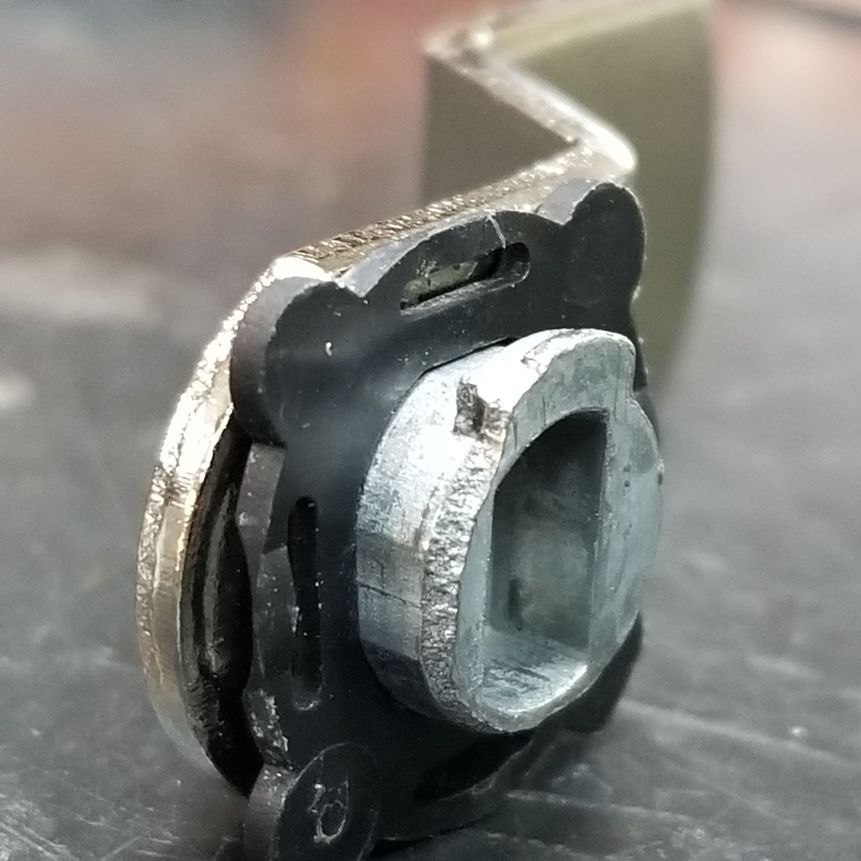 Переходник сложной формы были заменен на новый, выточенный на профессиональном итальянском копировальном станке и подогнанный вручную. Для этого юбка и ограничитель угла поворота были соединены воедино расплавленным черным полимером. От микродеформации после зажимания в тисках станка при извлечении полимера поврежденная ранее силуминовая юбка рассыпалась и дальнейшая обработка и подгонка производилась вручную без копирования по образцу.