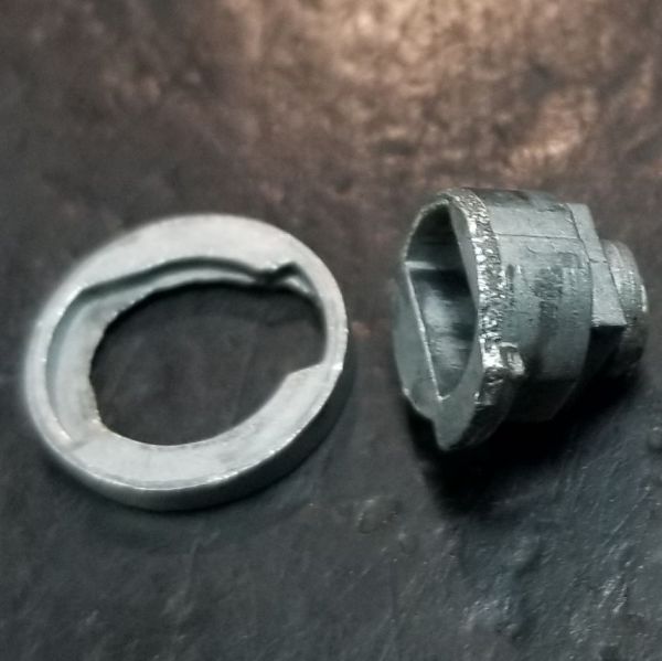 3. Мощный стальной засов запирающий отсек стола закреплен на тончайшей силуминовой юбке толщиной всего 0,7мм. Чтобы она сломалась достаточно несколько раз при закрытом замке прихлопнуть дверцу или уверенно подергать за ручку пытаясь её открыть шухлядку. О неисправности свидетельствует появляющийся повернутом для разборки положении люфт хвостовика, абсолютно не свойственный подобным мебельным замкам с простой и надежной установкой засова непосредственно на конце ключевого секретного барабана, без лишних тонких и технологически сложных промежуточных узлов.